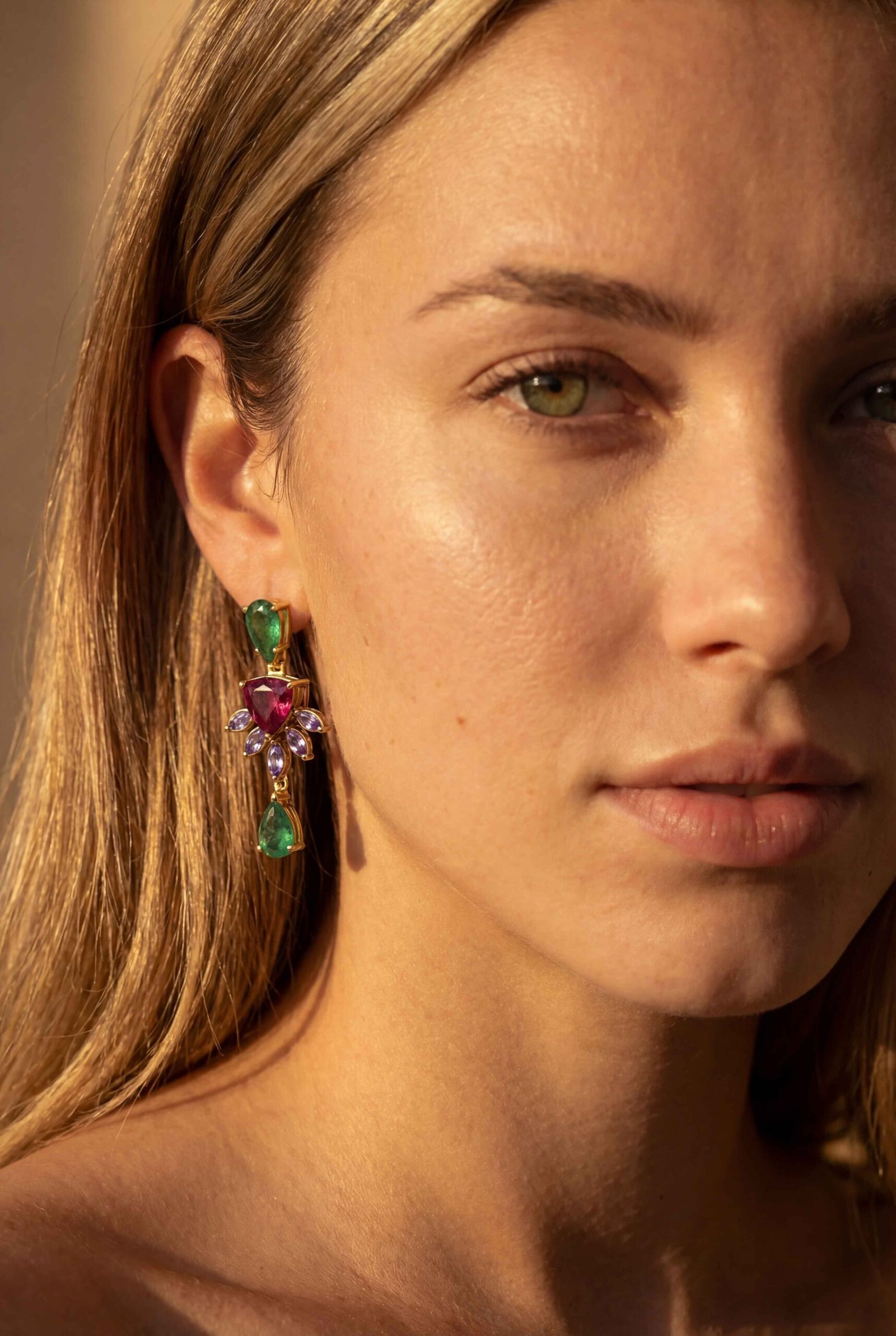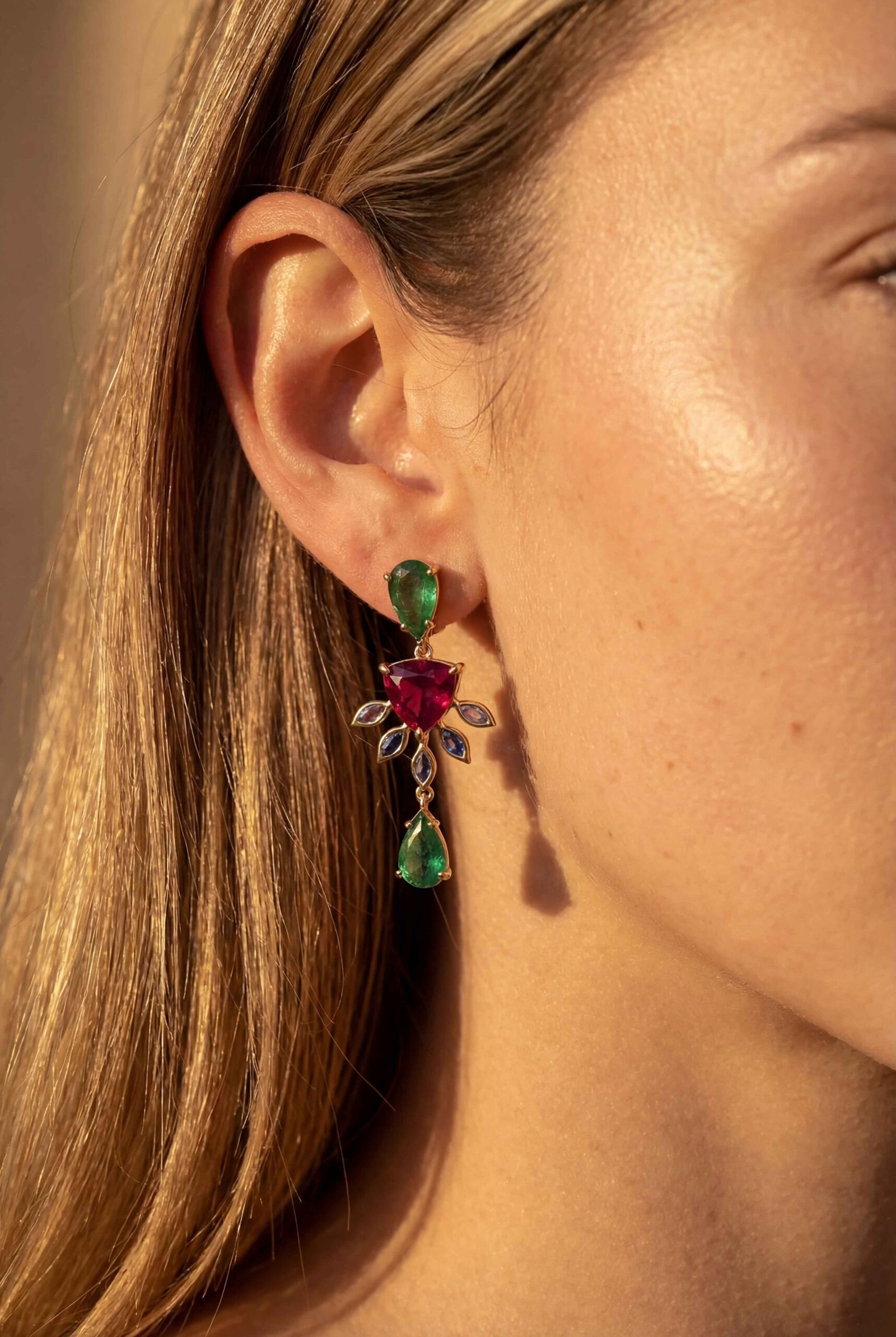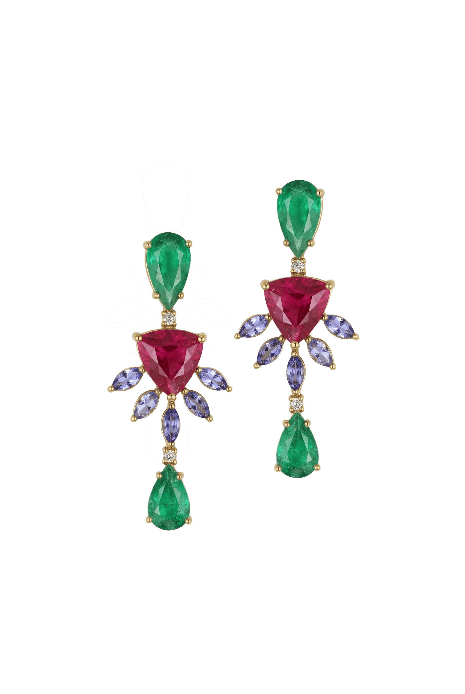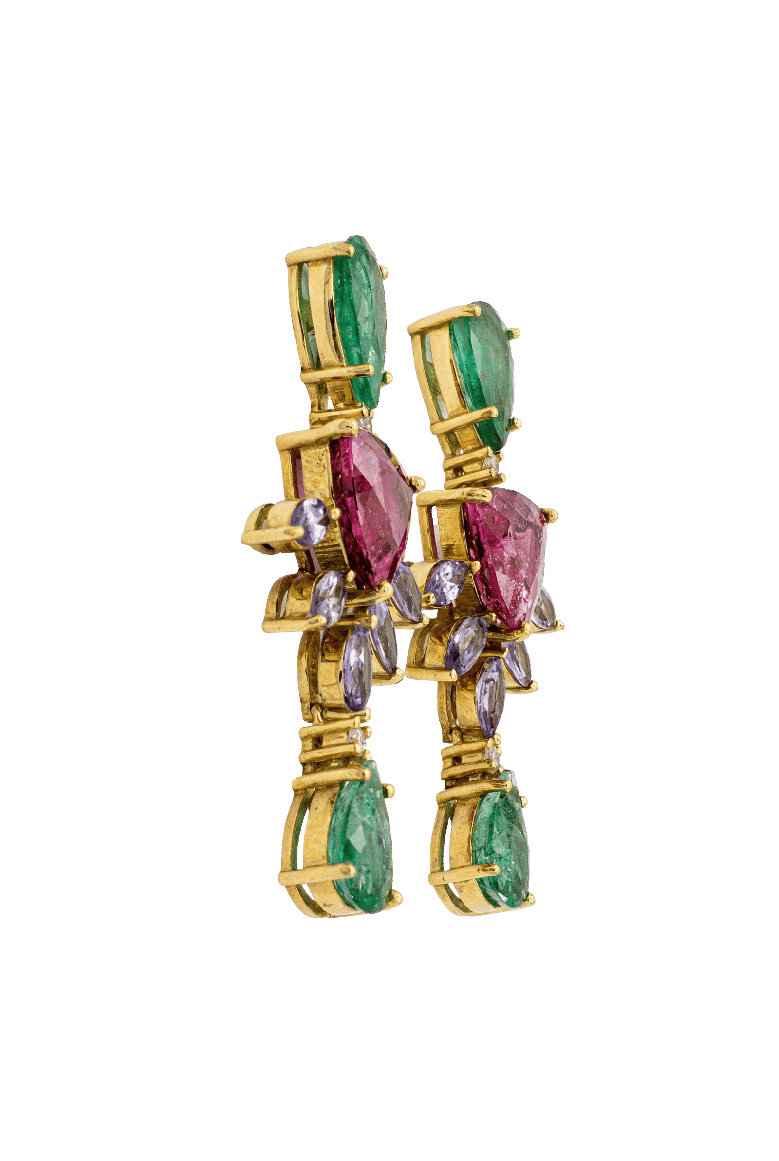 Brinco em ouro 18k modelo Pendente em ouro 18k com Rublita, Tanzanita e Esmeralda Gota
